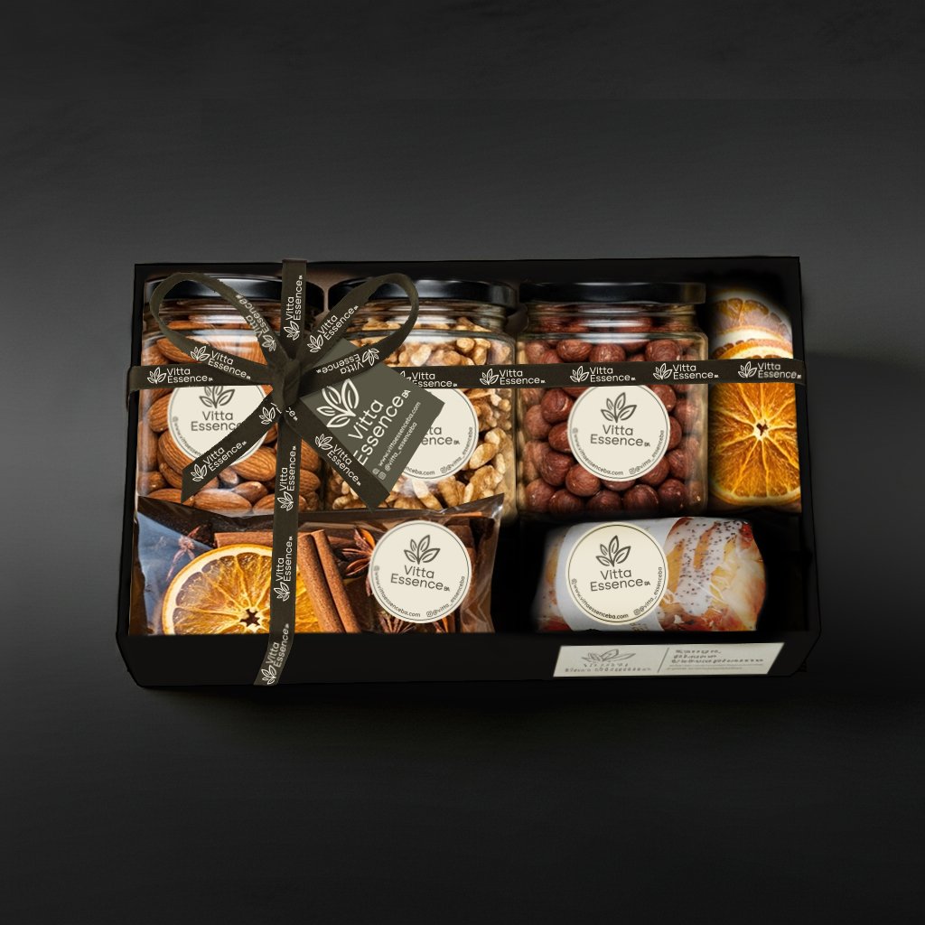 - Una propuesta delicada y sofisticada que combina tres frascos de frutos secos premium (almendras, nueces y avellanas), junto a un mini budín free gluten elaborado artesanalmente, sin conservantes ni aditivos de limón y amapolas.